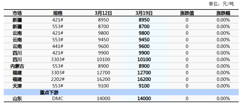 1)本周工业硅现货市场价格较上周相比维稳运行,截至3月19日新疆地区421#价格8950元/吨,云南地区421#价格9800元/吨,四川地区421#价格9900元/吨。