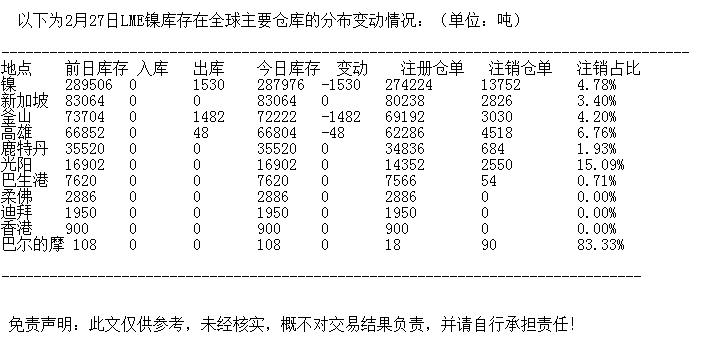 LME 2月27日镍库存分布情况