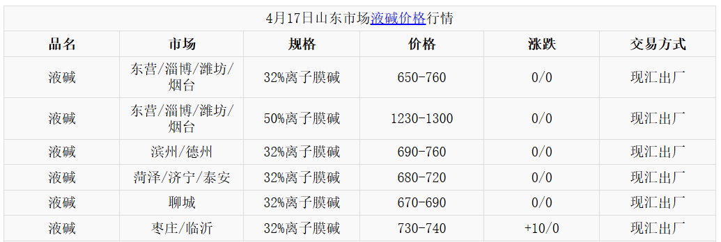今日,山东液碱市场整体持稳为主,送主力下游32碱量依然较大,多数企业目前降库为主,个别企业高度碱库存偏高,价格小幅下滑。其中鲁西南32%离子膜碱主流成交670-720;鲁中东部32%离子膜碱主流成交650-760,50%离子膜碱1230-1300;鲁北32%离子膜碱主流成交690-760;鲁南32%离子膜碱主流成交730-740。(单位:元/吨)